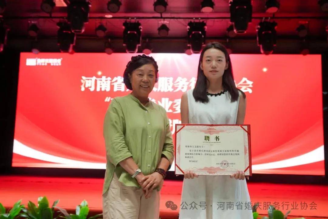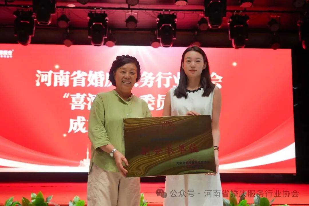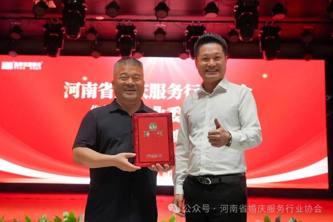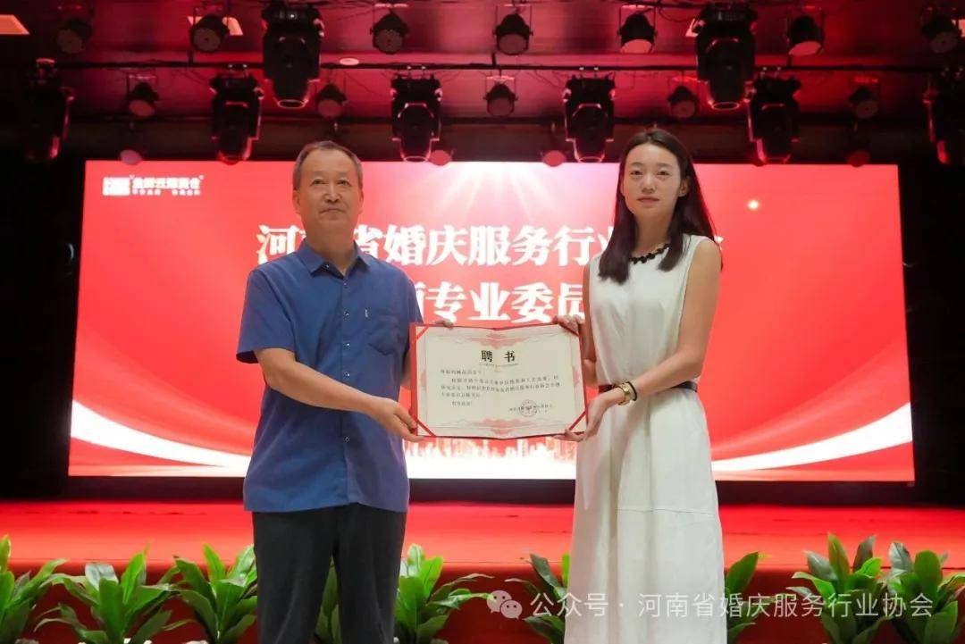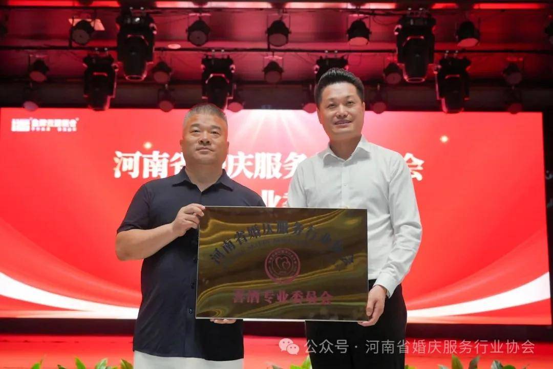 在热烈的掌声中,河南省婚庆服务行业协会党支部书记、会长陈平恒将省婚协喜酒专业委员会的牌匾正式授给专委会主席池金清先生,并为池总颁发了任职聘书。