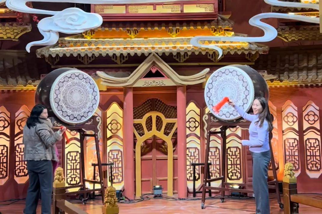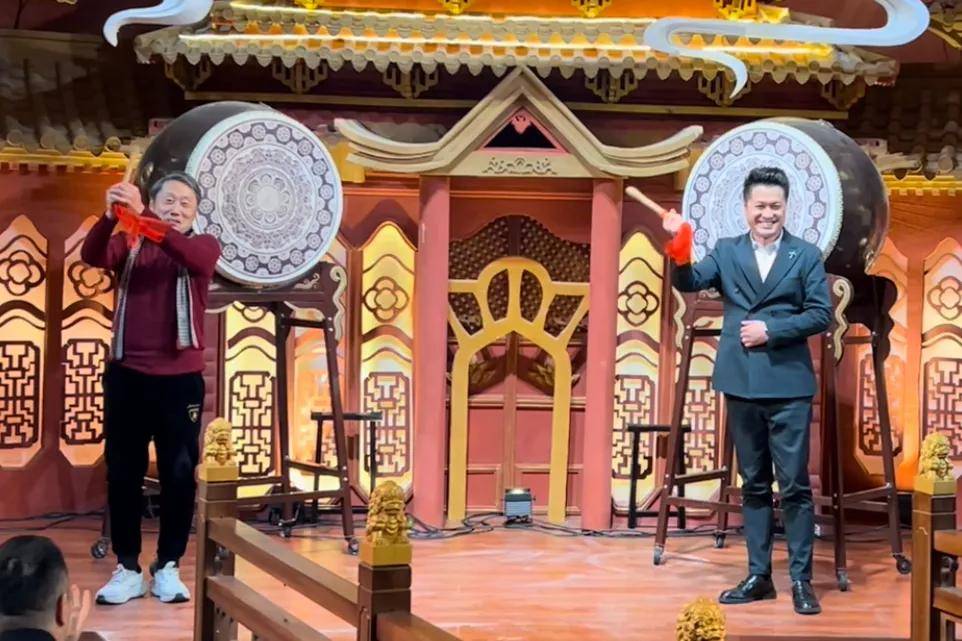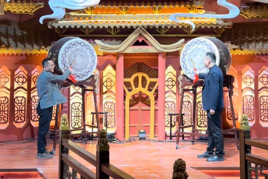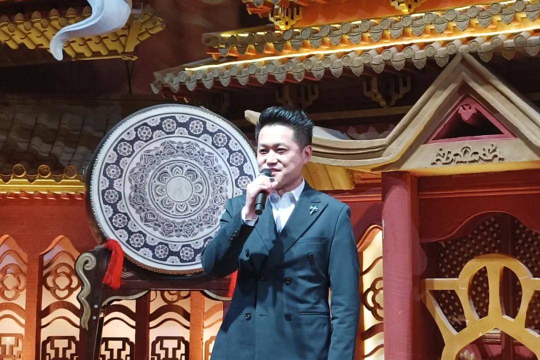 协会副会长兼婚嫁产业专委会主席、河南云上花开宴会艺术中心董事长张冬勇击鼓,副会长兼影视传媒专委会主席、河南出彩影视传媒公司董事长王雪原登台击鼓。