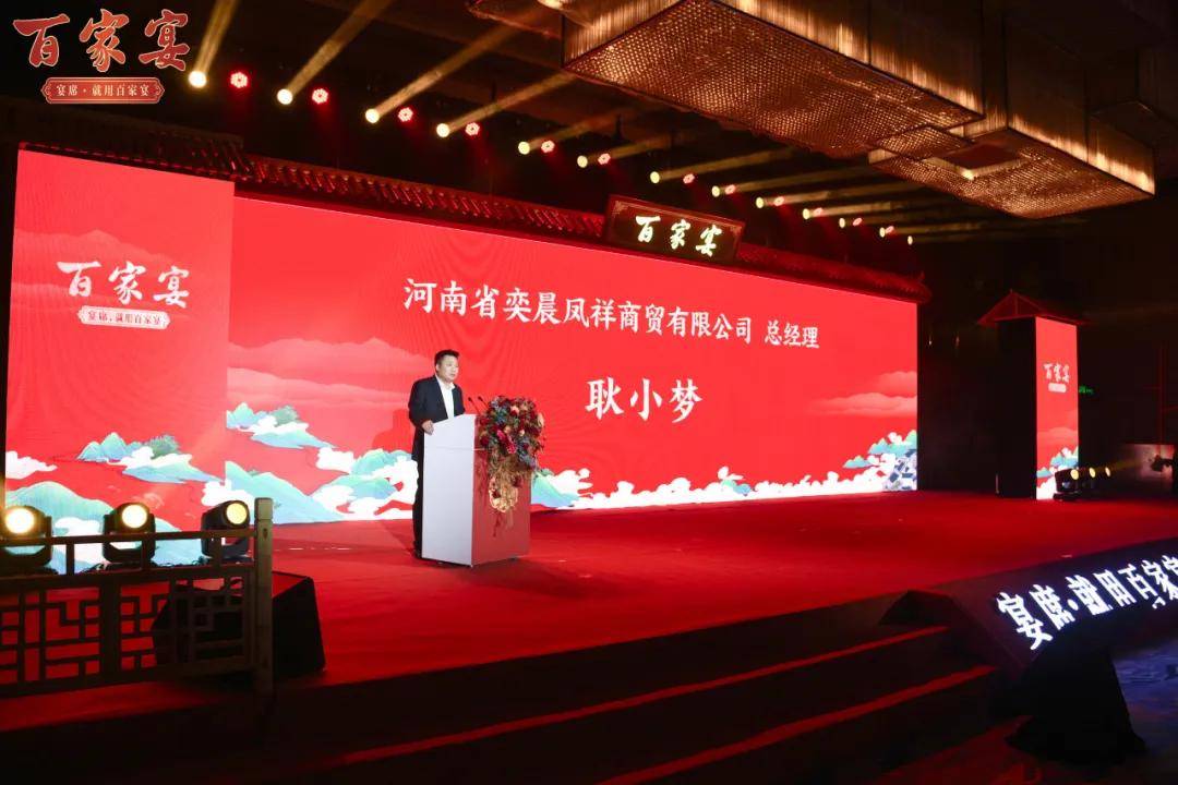 百家宴品牌河南总运营商、河南奕晨凤祥商贸有限公司总经理耿小梦在发布会上详细介绍了百家宴新品的销售策略,以主打婚宴、寿宴、宝宝宴、升学宴市场为主的宴席用酒。