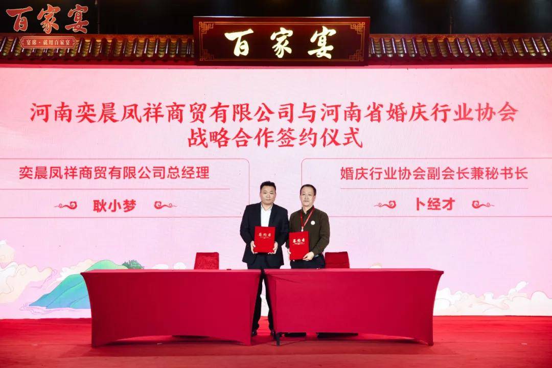 河南省婚协协会副会长兼秘书长卜经才与 河南奕晨凤祥商贸有限公司总经理耿小梦在发布会上签订了战略合作协议,大力支持百家宴酒新品系列进军河南喜酒市场。