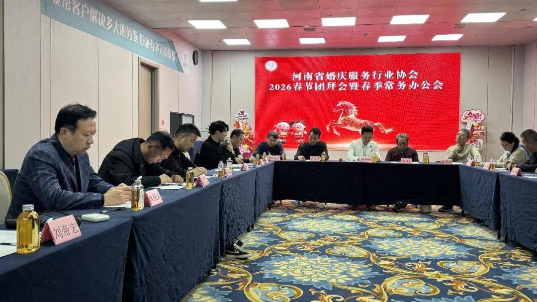 2026年2月27日下午,河南省婚庆服务行业协会春节团拜会暨春季常务办公会在郑州高新区金玺棠国潮大酒店隆重召开。河南省婚庆服务行业协会党支部书记、会长陈平恒,专家顾问张英科、法律顾问柯连友、战略发展顾问常保兴,专家委员会主席郭建军,婚纱摄影专委会主席程续良,婚恋服务专委会主席闫肃,影视传媒专委会主席王雪原,职业技能竞赛委员会(筹)副主席郭纪军,专家委员会副主席赵健全,专家委员会成员方柯柯,副会长于红杰、李英魁、王星、秦源长、张佳、贺勇、徐鸣、刘帝宏、李深、许春满、靳天路、赵永波,副秘书长东门韵紫、王岩峰等共同参加会议。(排名不分先后)