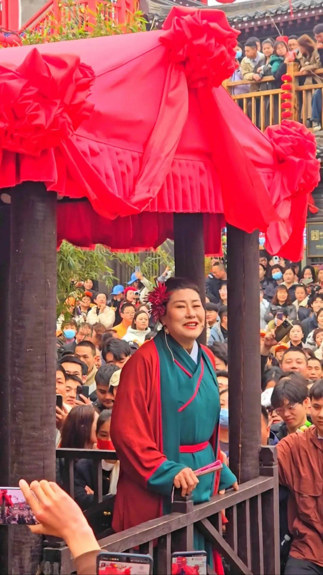 开封王婆不是真的媒婆,而是景区一位以“扮演媒婆”为核心表演内容的景区演员。她通过“说媒”这个形式与游客互动。